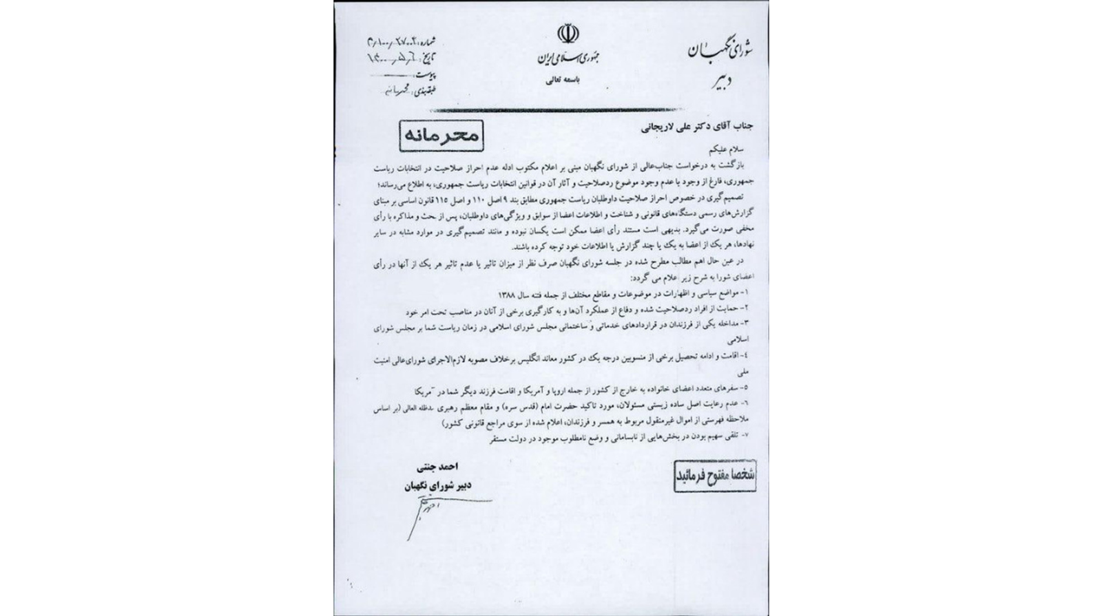 در تصویری که روز شنبه ۲۷ آذر از یک نامه با سربرگ شورای نگهبان در رسانه‌های اجتماعی منتشر شد، دلایل رد صلاحیت علی لاریجانی مواردی از قبیل مواضع سیاسی در سال ۸۸، حمایت از افراد رد صلاحیت شده و عدم ساده‌زیستی اعلام شده بود.