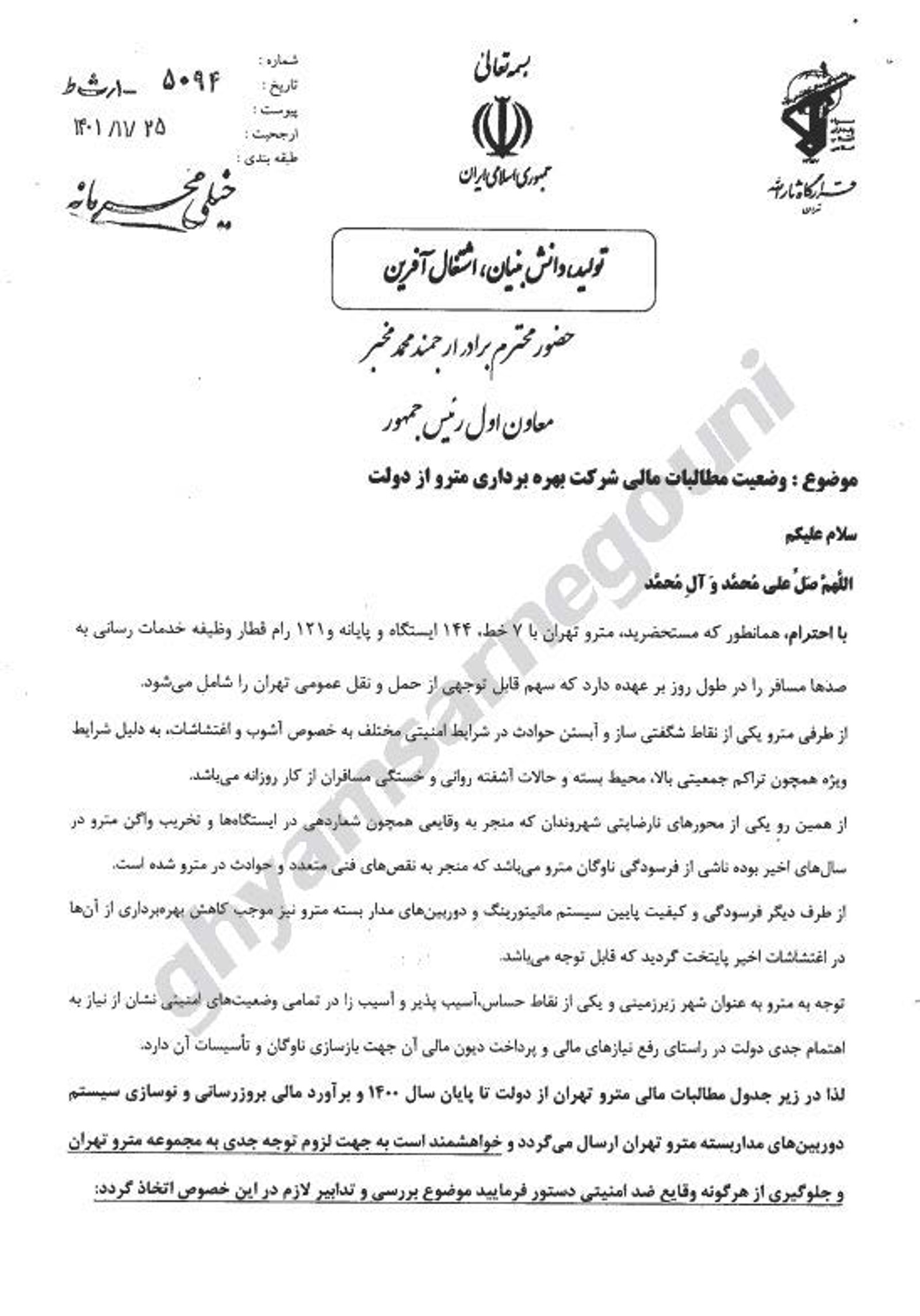 یکی از اسناد نامه فرمانده کل سپاه پاسداران به معاون اول رئیسی درباره دوربینهای مداربسته مترو، هزینه نوسازی آنها و همچنین طلب شرکت مترو از دولت است.