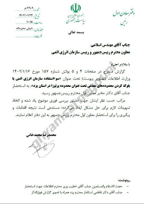 این نامه افشا میکند گزارش «سوءاستفاده سازمان انرژی اتمی با بلوکه کردن محدودههای معدنی، تحت عنوان محدوده پرتوزا در استان یزد» به اطلاع مخبر رسیده و دستور «بررسی فوری» موضوع یاد شده و اتخاذ تمهیدات لازم به منظور «حل مشکل» ایفاد شده است.