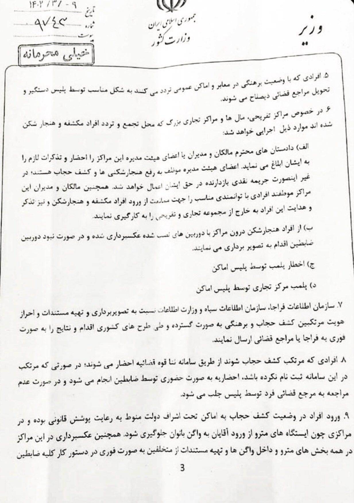 در این بخشنامه که به تاریخ نهم خرداد منتشر شده، خطاب به برخی دستگاههای جمهوری اسلامی از جمله شهرداری تهران و شرکت مترو پایتخت آمده: «ورود افراد در وضعیت کشف حجاب به اماکن تحت اشراف دولت منوط به رعایت پوشش قانونی بوده است.»