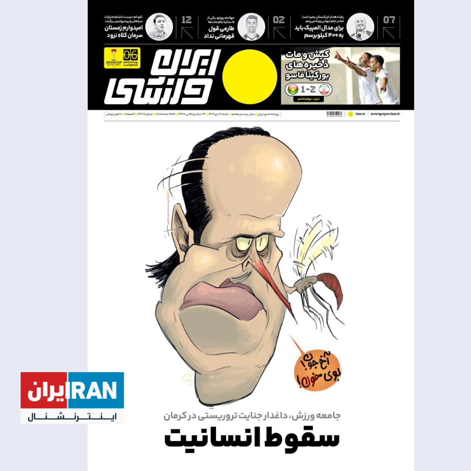 در ادامه حملات رسانه‌های جمهوری اسلامی و صداوسیما به علی کریمی در پی موضع‌گیری او درباره انفجارها در کرمان در سالگرد قاسم سلیمانی، این بار ایران ورزشی و فرهیختگان، روزنامه‌های دولت و دانشگاه آزاد، در صفحه اول خود با کاریکاتورها و تیترهایی به اسطوره فوتبال ایران حمله کردند.