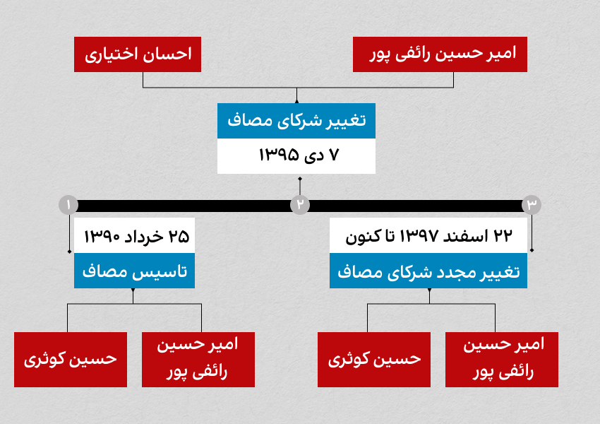 در دی ماه ۱۳۹۵، حسین کوثری با دریافت حق الشرکهاش از موسسه خارج و کمی بعد فردی به نام احسان اختیاری جایگزین شد. دوباره در اسفند ۱۳۹۷، حسین کوثری شریک و احسان اختیاری خارج شد. این شرح مختصری از وضعیت مصاف است.