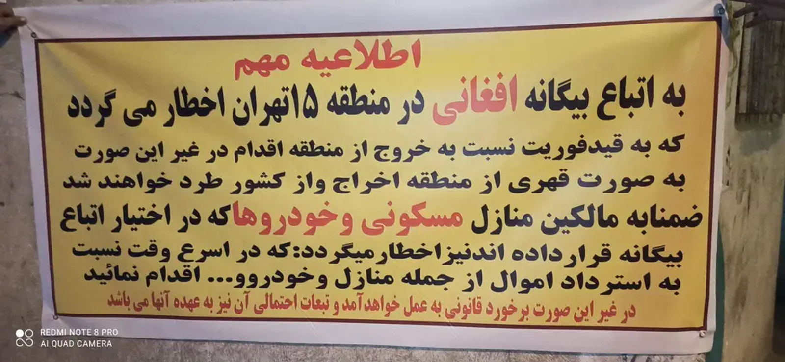 یک مخاطب دیگر افغانستان‌اینترنشنال از منطقه ۱۵ تهران (محل وقوع این درگیری) تصویر اطلاعیه‌ای را فرستاده است که در آن به مهاجران افغان هشدار داده شده فورا این محله را ترک کنند.