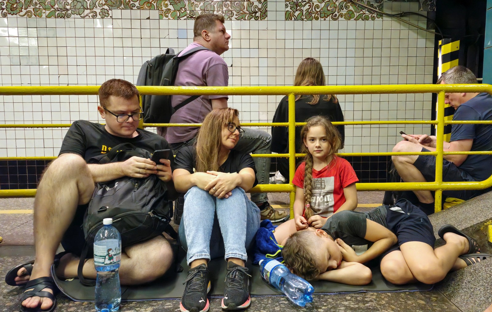 پناه گرفتن شهروندان اوکراینی در یک ایستگاه مترو در زمان حمله هوایی روسیه، کی‌یف، پنجم شهریور