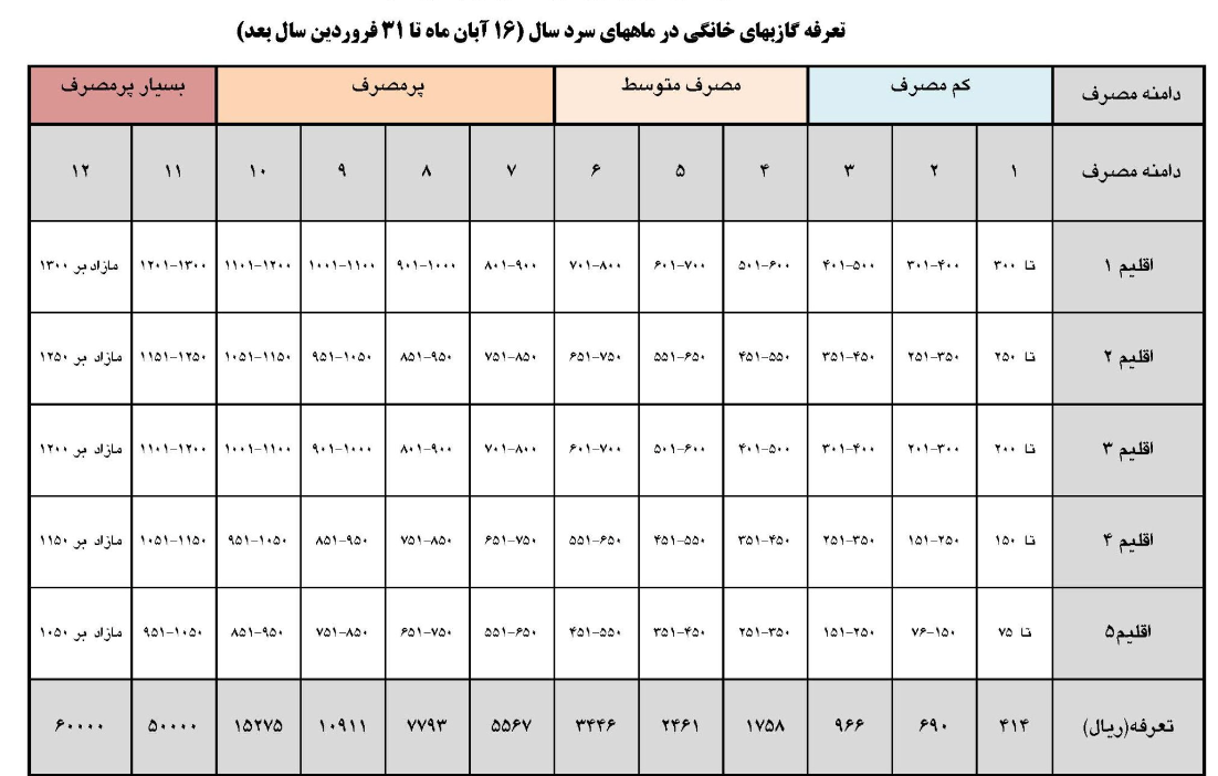 در ماهههای گرم سال که از اول اردیبهشت تا ۱۵ آبانماه در نظر گرفته میشود، میزان مصرف پایه در تمامی اقلیمهای کشور برابر در نظر گرفته میشود. اما در ماههای سرد که از ۱۶ آبان تا ۳۱ فروردین است، تعرفه گاز بر اساس میزان مصرف در اقلیمهای مختلف کشور، متفاوت است.