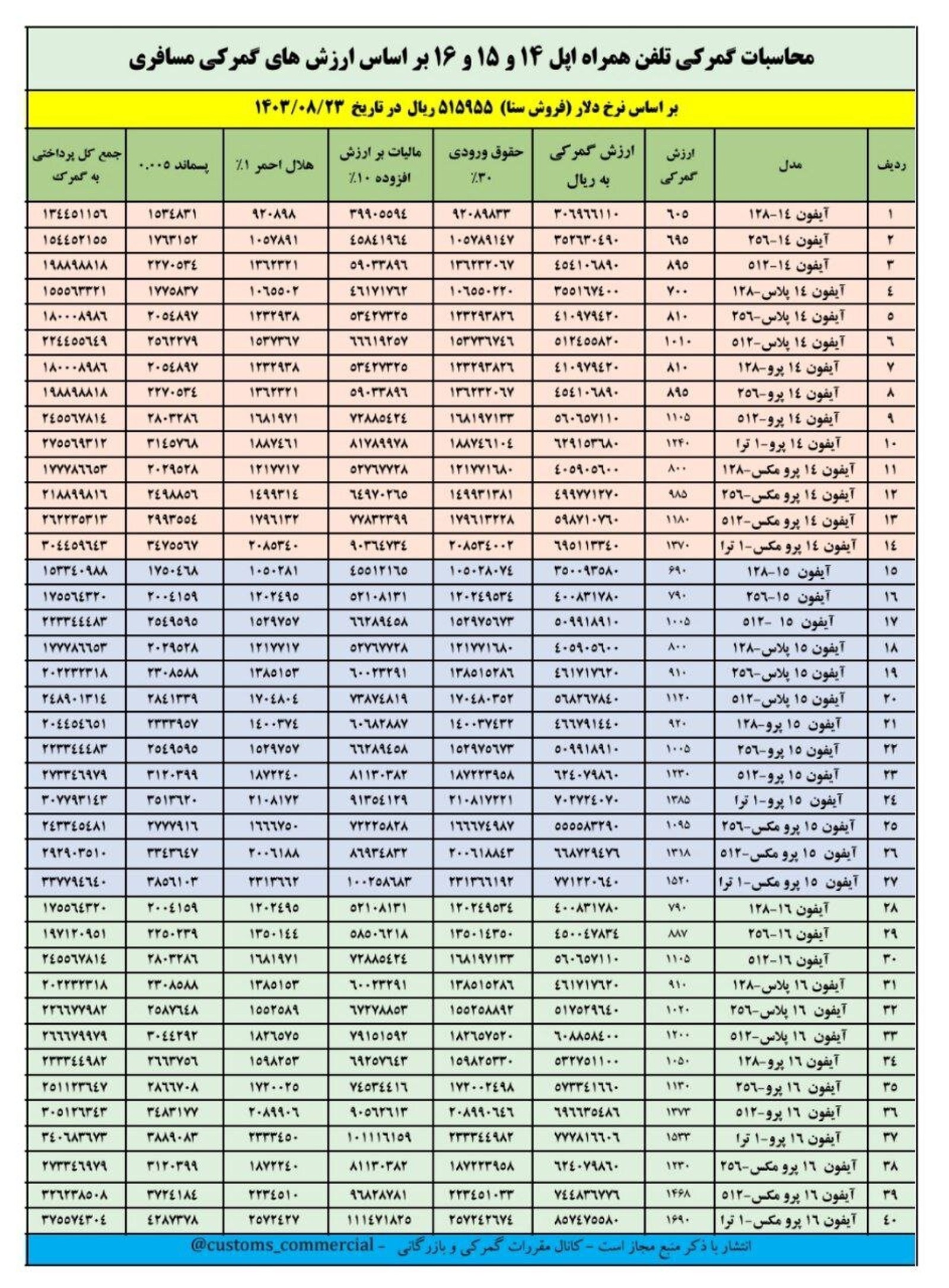جدول منتشر شده نشان می‌دهد حقوق ورودی و مالیات برای انواع این گوشی‌ها حدود ۴۱ درصد است که به طور پلکانی نسبت به ارزش اولیه محاسبه می‌شود؛ به طوری که در نهایت جمع دریافتی گمرک از هر گوشی، حدود ۴۴ درصد ارزش هر گوشی است.