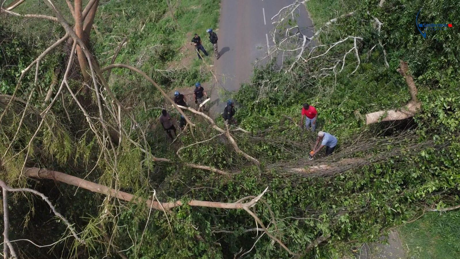در بیمارستان مایوت، مادری با یک گهواره نوزاد در راهرویی پر از آب مشاهده شد. قایقهای پلیس واژگون شده و درختان نارگیل از سقف ساختمانها عبور کردهاند.