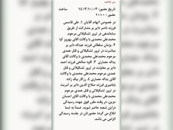 منبع مطلعی که با ایران اینترنشنال گفتگو کرد، با اشاره به کیفرخواست صادره برای قتل محمدی گفت: «عنوان اتهامی آمریت در قتل، فاقد نص قانونی است و از این جهت تعیین مجازات برای آن فاقد وجاهت قانونی است، اگرچه ممکن است دادستانی با تفسیر سلیقهای از حکم شرعی، آمریت در قتل را معادل معاونت در قتل بداند که مبنای قانونی ندارد.»
