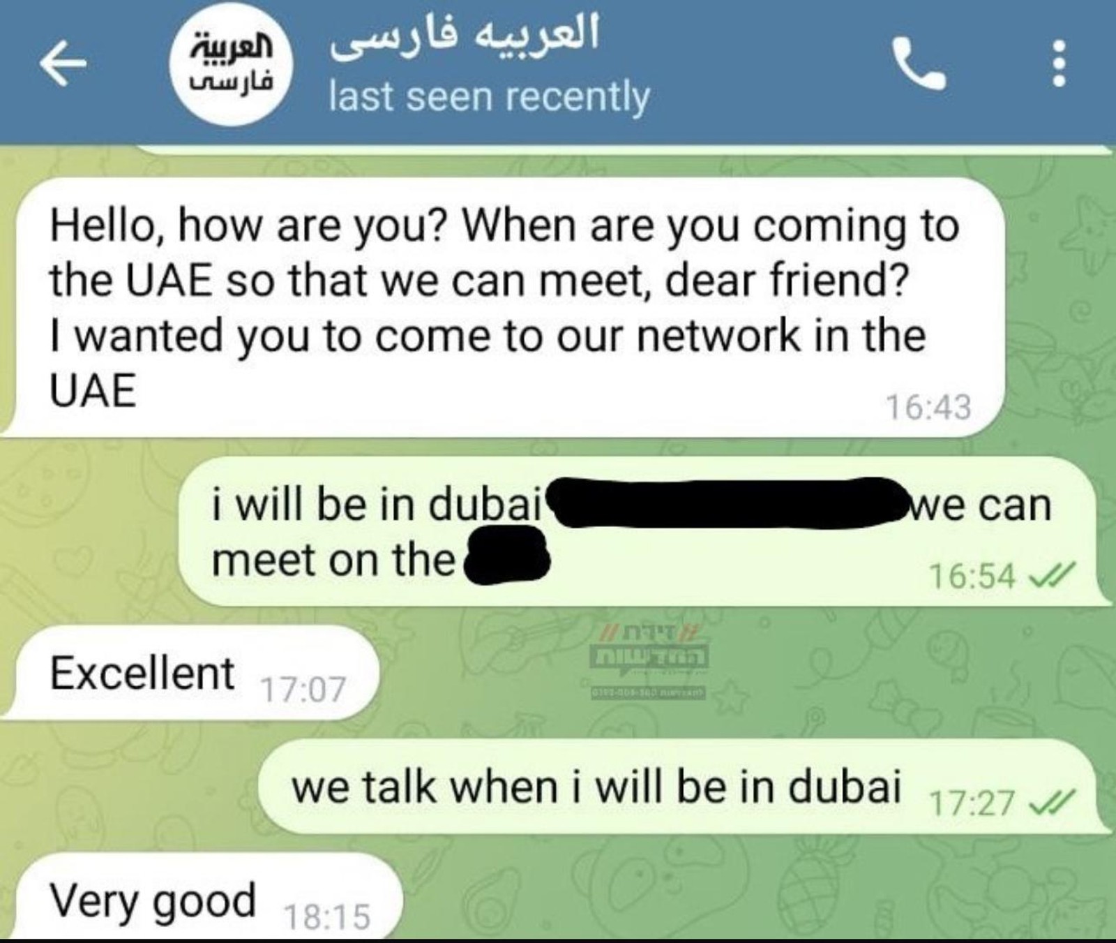 مقامات اطلاعاتی اسرائیلی دریافتند این نیروها از طریق تلگرام با این تاجر اسرائیلی تماس گرفتهاند و خود را بهعنوان کارکنان بخش فارسی رسانه سعودی «العربیه فارسی» معرفی کردهاند.