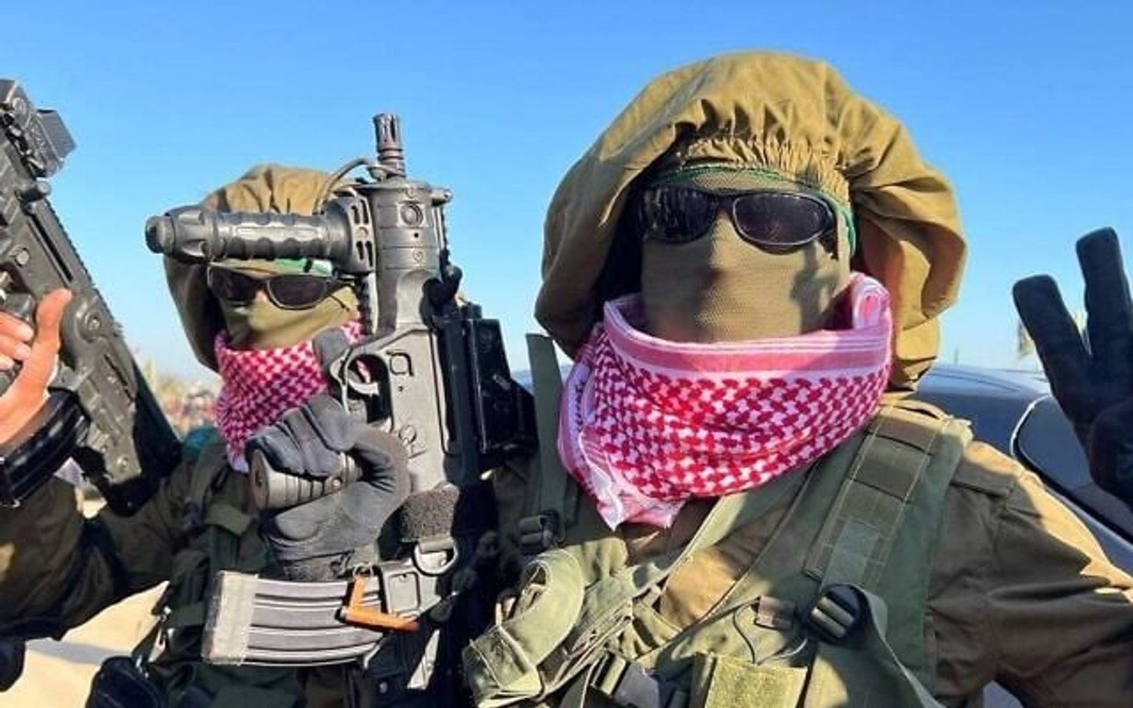 شماری از شبهنظامیان حماس با یونیفورم و جلیقههای نظامی ارتش اسرائیل و سلاحهایی که در روز هفتم اکتبر از اسرائیل دزدیده شدهاند، به محل آزادی گروگانها آمدند.