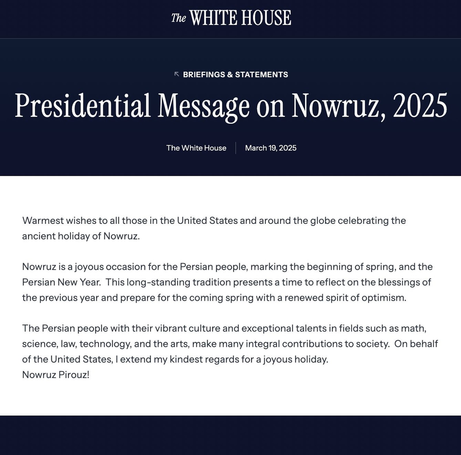 ترامپ در پیامی که کاخ سفید شامگاه چهارشنبه ۲۸ اسفند منتشر کرد، نوشت: «از طرف ایالات متحده، بهترین آرزوهایم را برای این جشن خجسته تقدیم می‌کنم. نوروز پیروز!»