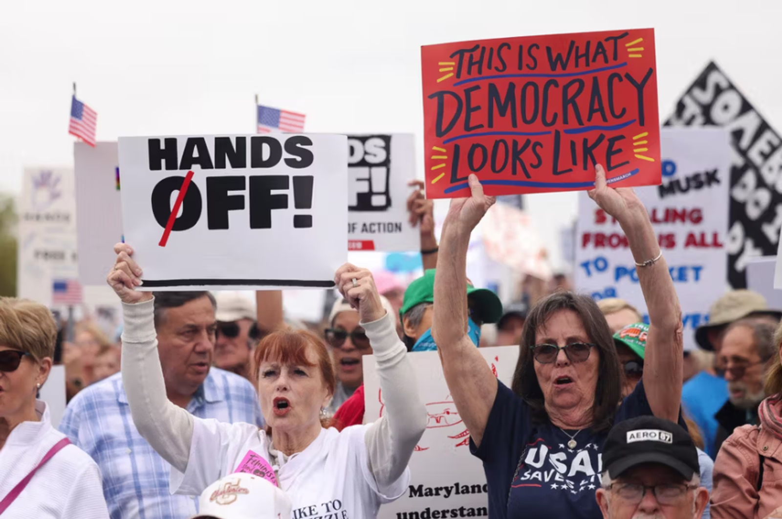 هزاران معترض روز شنبه در واشینگتن و دیگر شهرهای آمریکا گرد هم آمدند تا مخالفت خود را با سیاست‌های دونالد ترامپ، رییس‌جمهور ایالات متحده، در زمینه اخراج مهاجران، اخراج کارمندان دولتی و جنگ‌های غزه و اوکراین ابراز کنند.