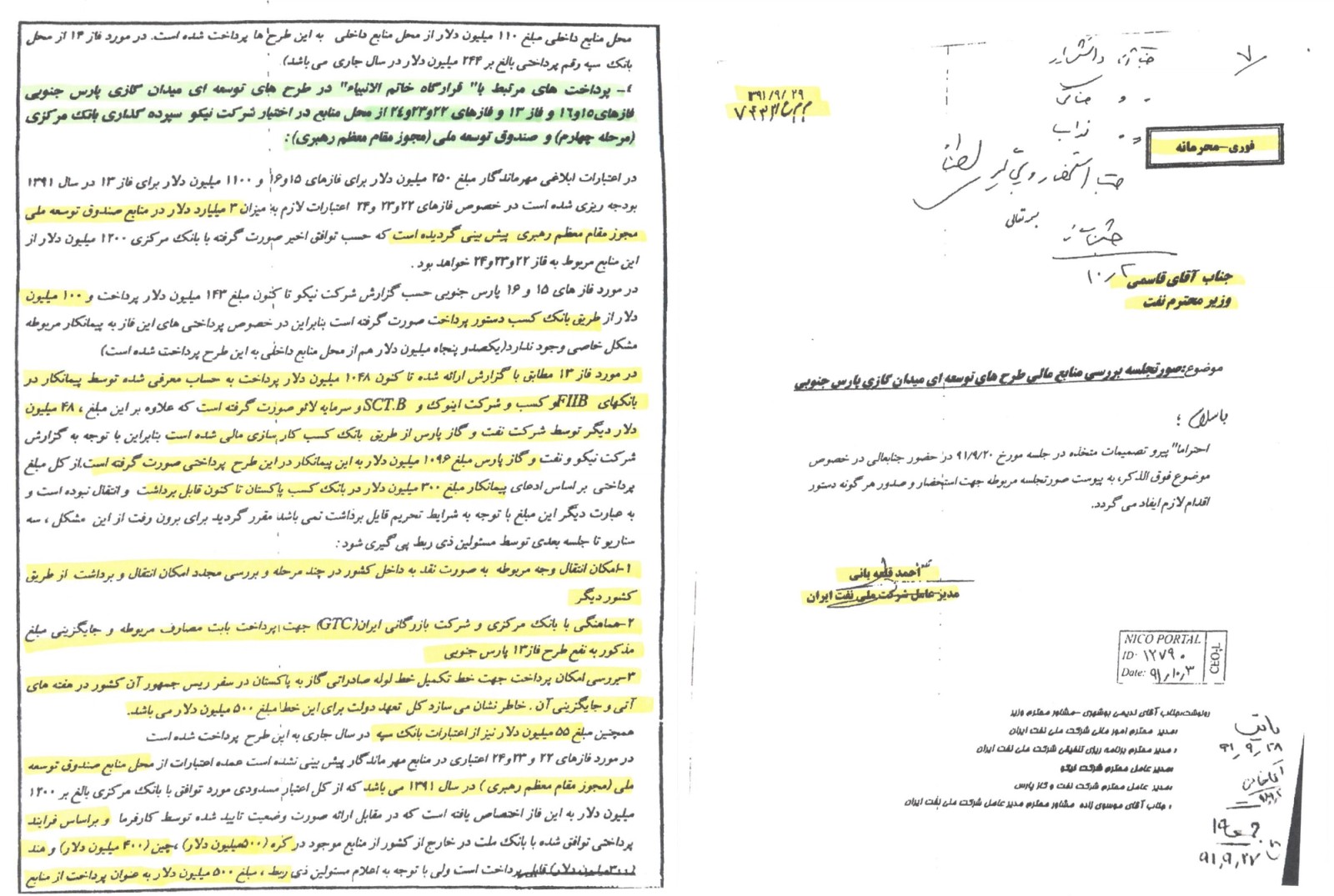 این سند صورتجلسه مذاکراتی در سال ۱۳۹۱ در وزارت نفت درباره طرحهای توسعه میدان گازی پارس جنوبی است که احمد قلعهبانی، رییس وقت شرکت ملی نفت به رستم قاسمی، وزیر وقت نفت ارائه کرده و در آن تصریح شده که با دستور علی خامنهای، رهبر جمهوری اسلامی، مبلغ قابلتوجهی از صندوق توسعه ملی در اختیار قرارگاه خاتمالانبیاء سپاه پاسداران قرار گرفته تا صرف توسعه چند فاز از پارس جنوبی شود.