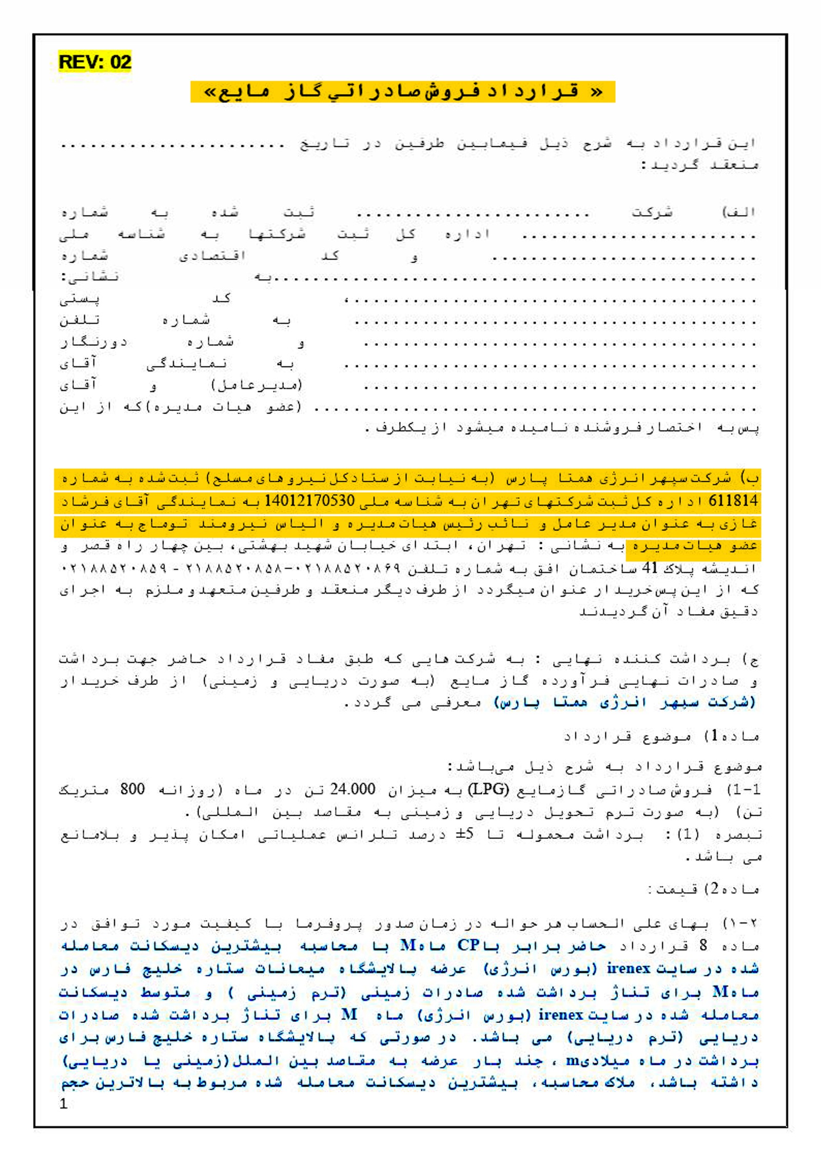 در سندی دیگر که پیشنویس یک قرارداد فروش گاز مایع است، شرکت سپهر انرژی همتا پارس بهطور مشخص نماینده ستاد کل نیروهای مسلح معرفی شده است.
