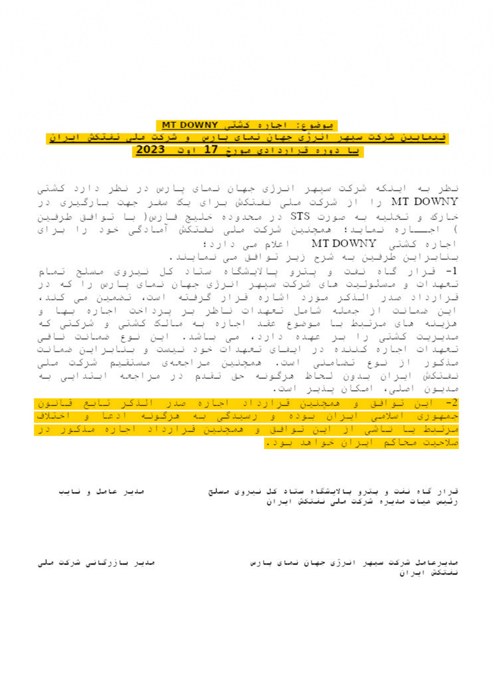 همچنین در سندی دیگر که پیشنویس اجاره کشتی تحریمی Downy متعلق به شرکت ملی نفتکش ایران است، قرارگاه نفت و پتروپالايشگاه ستاد كل نيروى مسلح تمام تعهدات و مسوولیت شرکت سپهر انرژی جهاننمای پارس را تضمین میکند.