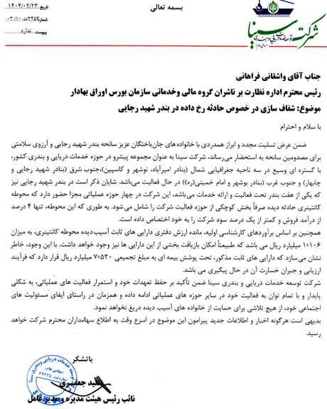 سازمان بورس اوراق بهادار چهارشنبه ۲۴ اردیبهشت نامهای از شرکت «توسعه خدمات دریایی و بندری سینا» مالک محوطه سینا در بندر رجایی منتشر کرد که در آن آمده این شرکت در چهار حوزه عملیاتی در بندر رجایی حضور دارد و محوطه کانتینری منفجرشده صرفا «بخش کوچکی» از فعالیتهای شرکت در بندر رجایی بوده است.