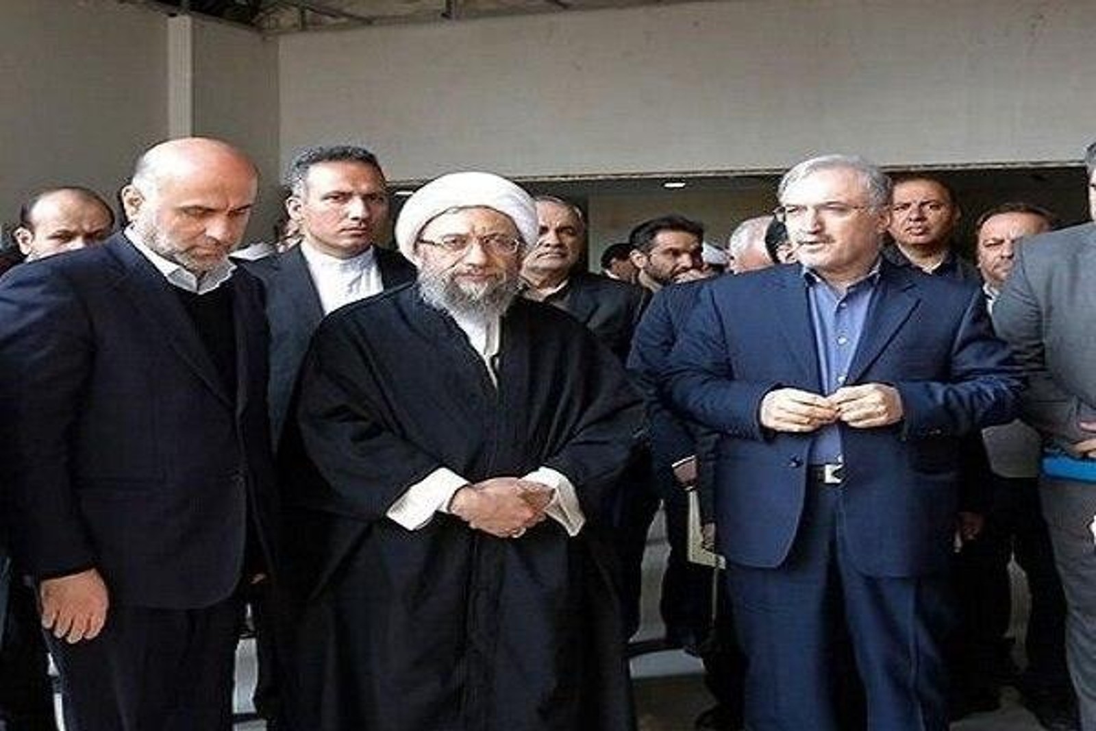 اکبر طبری، نفر اول از سمت چپ در کنار صادق آملی لاریجانی، رییس وقت قوه قضاییه. نام سعید نمکی، وزیر سابق بهداشت نیز در پرونده فساد واردات واکسن کرونا مطرح شد. خود آملی لاریجانی هم به سوء‌استفاده از حساب‌های قوه قضاییه متهم است