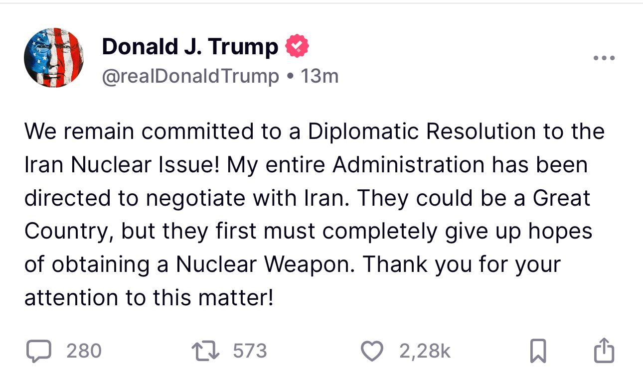 دونالد ترامپ، رییسجمهوری ایالات متحده، در پیامی تازه بر تعهد دولت خود به راهحل دیپلماتیک در قبال بحران هستهای جمهوری اسلامی تاکید کرد. آکسیوس نیز گزارش داده که ترامپ به اسرائیل گفته در حمله به تاسیسات اتمی ایران بهطور مستقیم مشارکت نخواهد کرد.