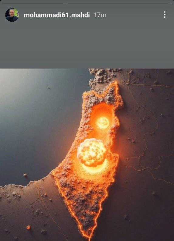 مهدی محمدی، مشاور امور راهبردی محمدباقر قالیباف، رییس مجلس شورای اسلامی، شنبه در استوری حساب کاربری خود در اینستاگرام تصویری را به اشتراک گذاشته که دو قارچ اتمی و پیامدهای یک حمله هستهای گسترده در سراسر اسرائیل را نشان میدهد.