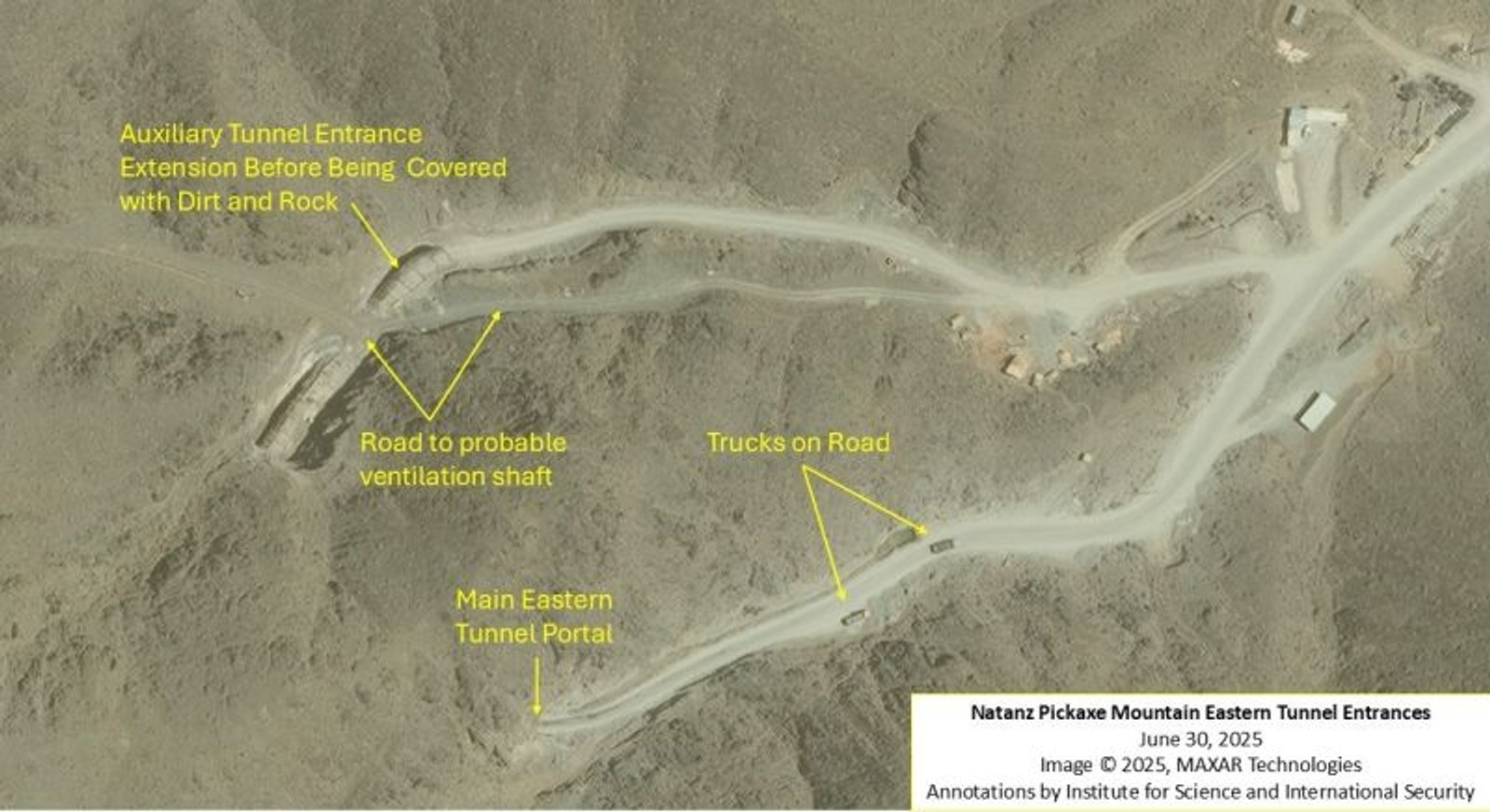 براساس این گزارش، تصاویر ماهوارهای ۱۰ اوت ۲۰۲۵ از شرکت مکسار نشان میدهد ورودیهای تاسیسات تونلی قدیمیتر که از سال ۲۰۰۷ ساخته شده بودند، با پوشش ضخیم بتنی تقویت و سپس با خاک پوشانده میشوند. این اقدام آشکارا با هدف مقاومسازی در برابر حملات هوایی یا خرابکاری انجام میشود.