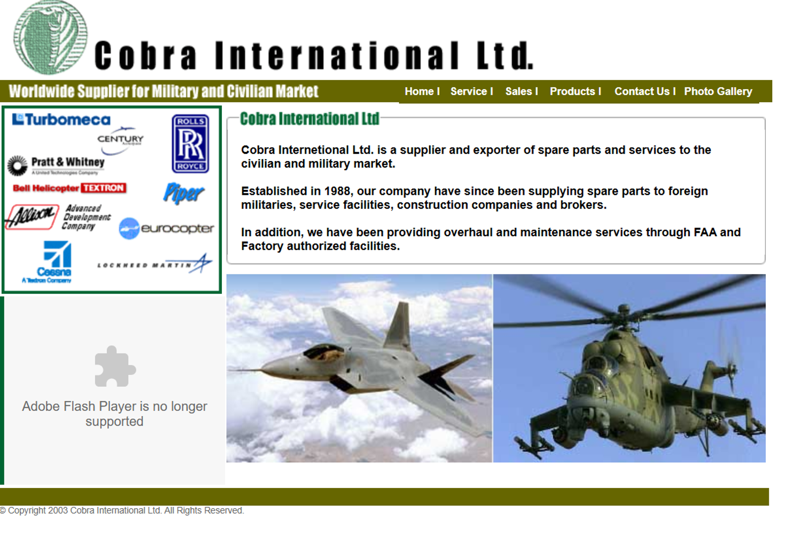 شرکت «کبرا اینترنشنال» مستقر در شهر یونیون‌سیتی نیوجرسی در وب‌سایت رسمی‌اش، خود را «تامین‌کننده و صادرکننده قطعات یدکی و خدمات برای بخش‌های نظامی و غیرنظامی» معرفی کرده است.
