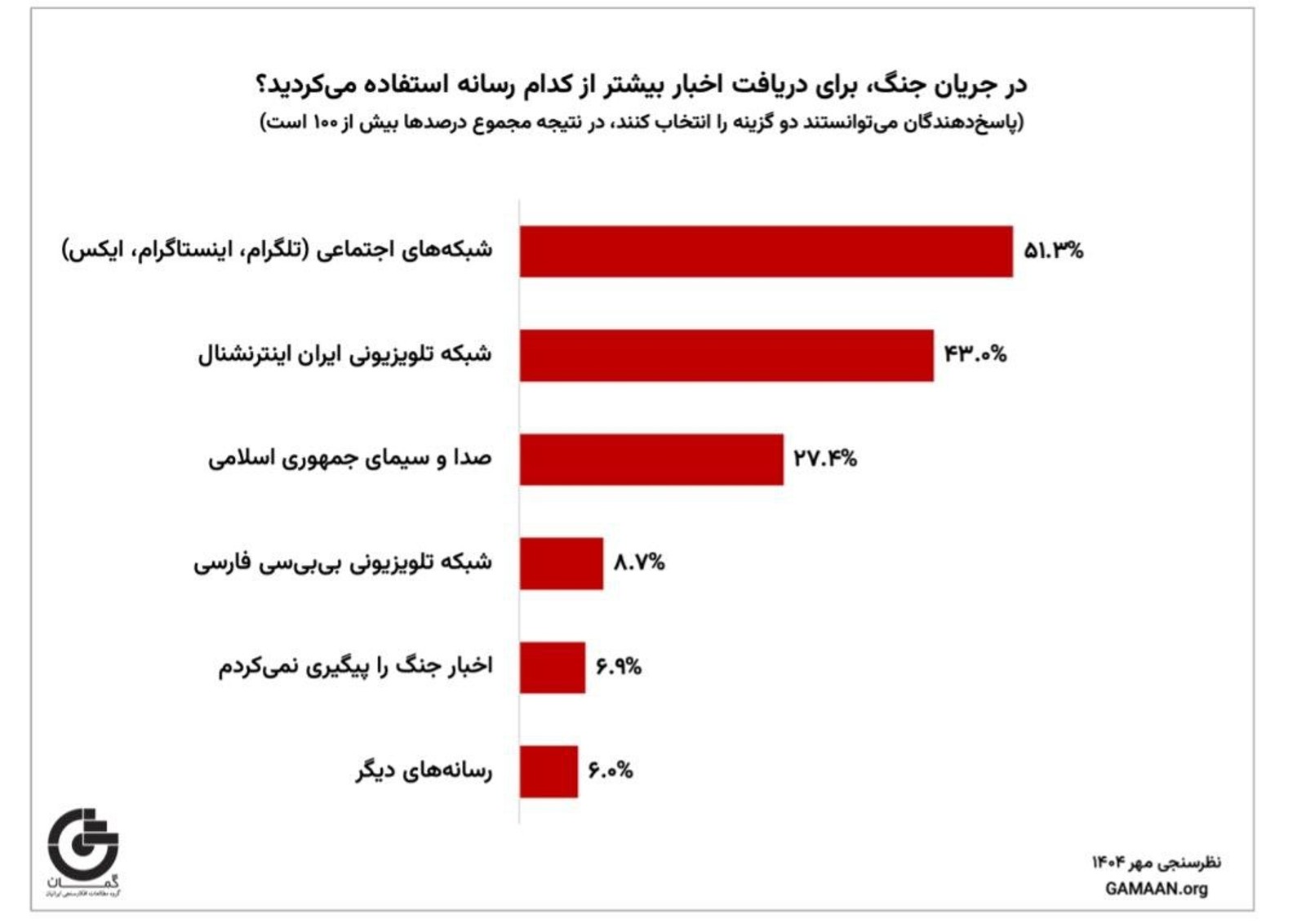 بر اساس داده‌های این نظرسنجی، شبکه‌های اجتماعی (مانند تلگرام، اینستاگرام و ایکس) منبع اصلی مردم برای اطلاع از اخبار در زمان جنگ بود و بیش از نیمی از جامعه (۵۱ درصد) از این طریق اخبار جنگ را دریافت کردند.