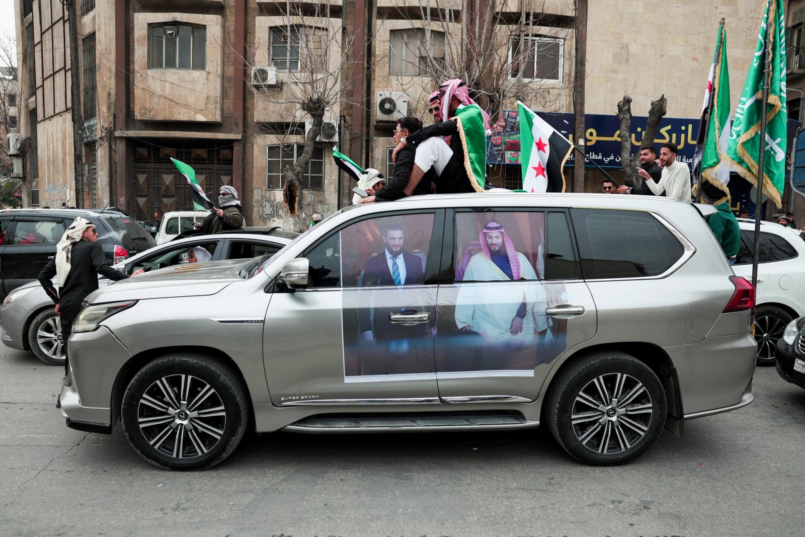 در حلب، نخستین شهر بزرگی که سال گذشته به‌دست نیروهای الشرع افتاد، مردم با خودرو و پرچم‌های دولت جدید به خیابان‌ها آمدند.