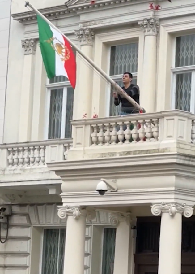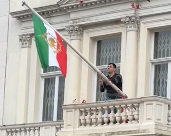 در همین حال، ایرانیان در تجمع مقابل سفارت حکومت ایران در لندن، پرچم جمهوری اسلامی را پایین کشیدند و پرچم شیر و خورشید را به جای آن نصب کردند.