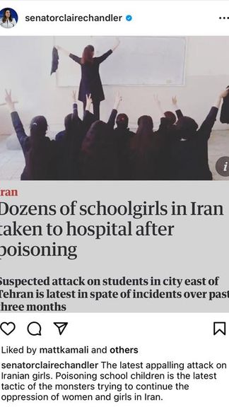 من جهة أخرى، كتبت السيناتورة كلير تشاندلر، رئيسة لجنة الشؤون الخارجية والدفاع والتجارة بمجلس الشيوخ الأسترالي، على حسابها في "إنستغرام": "هجوم مروع آخر على فتيات إيرانيات... تسمم تلميذات المدارس هو أحدث تكتيك من الوحوش لمواصلة الظلم على النساء والفتيات في إيران".