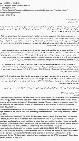 وكتب علي واعظ، عضو "مجموعة الأزمات الدولية"، في رسالة بالبريد الإلكتروني إلى محمد جواد ظريف، وزير خارجية إيران آنذاك: "باعتباري إيرانيًا وانطلاقًا من واجبي الوطني، ليس لدي أي تردد في تقديم أي مساعدة لك."
