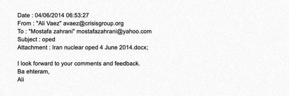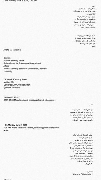وفي 4 يونيو (حزيران) 2014، أرسل بريداً إلكترونياً إلى زهراني وأرفق مقالاً بعنوان: "المخاطر المعرفية للدبلوماسية النووية مع إيران" وكتب: "أنا في انتظار تعليقاتكم وملاحظاتكم".