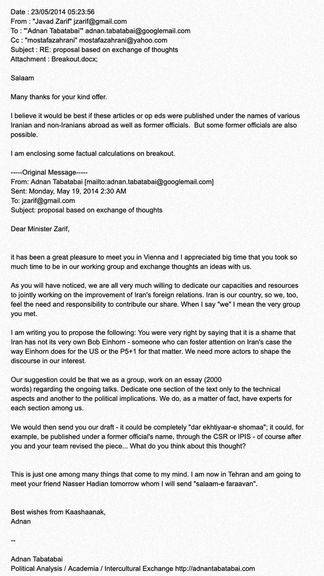 وأرسلت طباطبائي رابط المقال إلى زهراني، وقالت: "كما ذكرت الأسبوع الماضي، كتبت أنا ودينا مقالاً للنشرة حول الوقود النووي في بوشهر، وقد نُشرت اليوم. وكنا نحاول في المقال إظهار أن الحديث في الغرب عن أن إيران لا تحتاج إلى أكثر من 1500 جهاز طرد مركزي هو حديث خاطئ، ولا ينبغي لنا أن نتوقع من إيران أن تخفض عدد أجهزة الطرد المركزي بالقدر الذي يقوله البعض". وقد أرسل زهراني هذه الرسالة الإلكترونية إلى ظريف في نفس اليوم.
