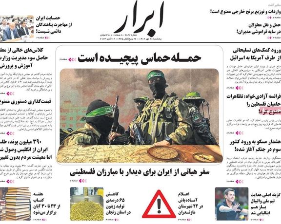 صحيفة "جوان"، المقربة من الحرس الثوري، هي الأخرى سلكت نهج الوعيد والتهديد واستخدمت في عنوانها الرئيسي: "سندمر نصف جيش إسرائيل"، وقالت إنه وفي حال قررت تل أبيب الدخول بريا إلى غزة فهذا يعني كارثة بالنسبة للجيش الإسرائيلي، إذ إن الفصائل الفلسطينية في قطاع غزة تنتظر مثل هذه الفرصة لتحميل إسرائيل ضربة غير مسبوقة.