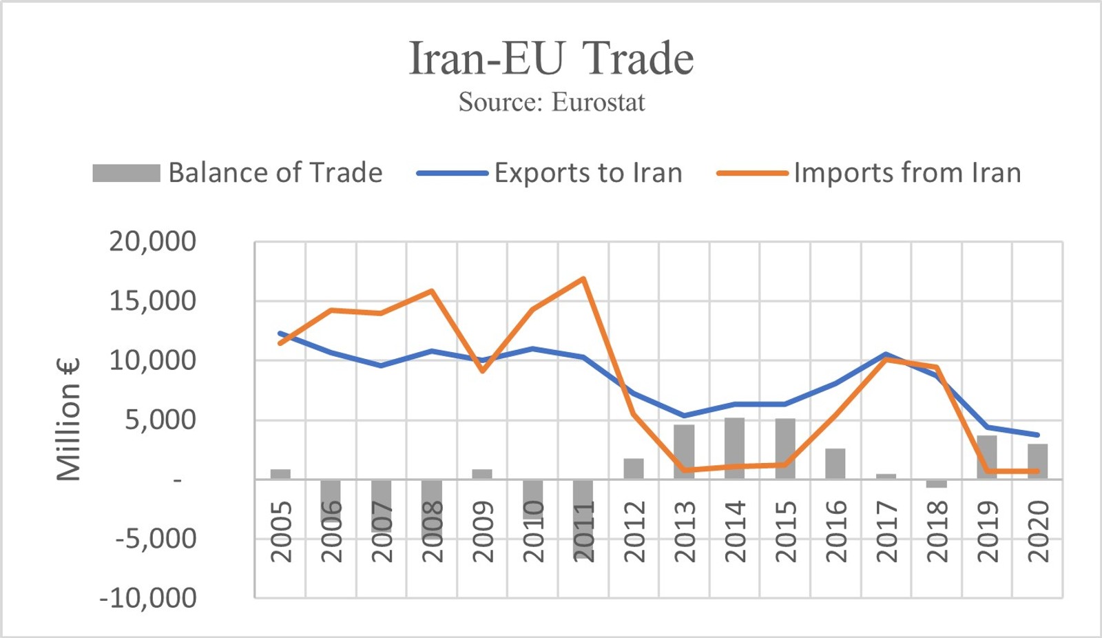 The history of Iran-EU trade over the last 15 years shows a downward trend, with a high degree of correlation with the severity of sanctions. When US-initiated secondary sanctions are in place, whether multilateral or unilateral, they quickly affect Iran-EU trade. EU states opposed the Trump administration’s unilateral maximum pressure strategy, but Trump’s sanctions had the same impact on Iran-EU trade as multilateral sanctions did prior to the JCPOA.