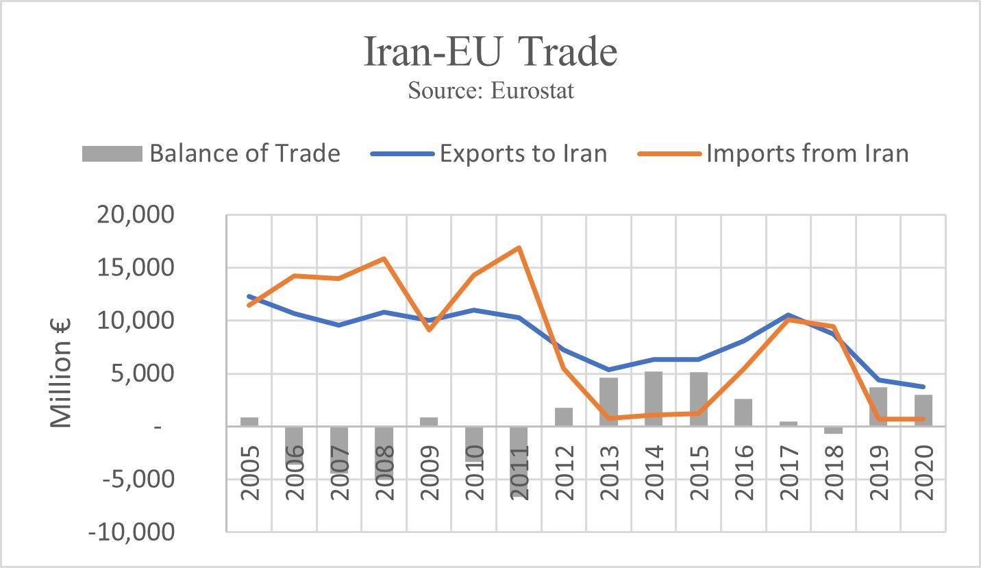 By contrast, trade between the EU and Saudi Arabia, Tehran’s chief rival in the Persian Gulf, benefits from diplomatic stability. Since 2005, EU-Saudi trade has enjoyed a general upward trajectory, even though it is sensitive to volatile markets for oil. However, the Saudis have managed to expand their non-crude exports to the EU. In 2020, 7.2 billion euros — 46 percent of Riyadh’s exports to the EU — were from non-crude oil, up from 3.84 billion euro in 2005.