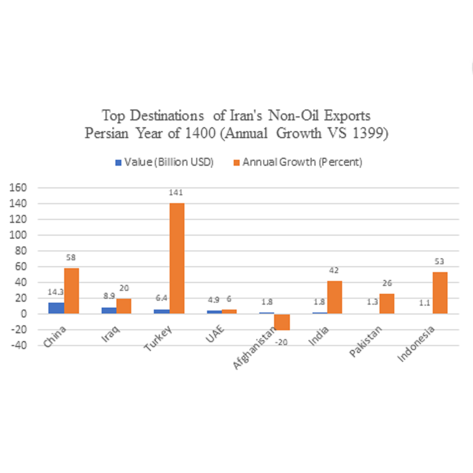 According to a report by the state-run Trade Promotion Center of Iran, key items in Iran’s non-oil exports were natural gas at $4.9 billion and 84 percent growth, polyethylene at $3.1 billion, methanol at $2.2 billion and 87 percent growth, and liquid propane at $1.9 billion and 96 percent growth. Four countries served as the destinations for 70 percent of Iran’s total non-oil export: Tehran exported $14.3 billion to China, $8.9 billion to Iraq, $6.1 billion to Turkey, and $4.9 billion to the United Arab Emirates.