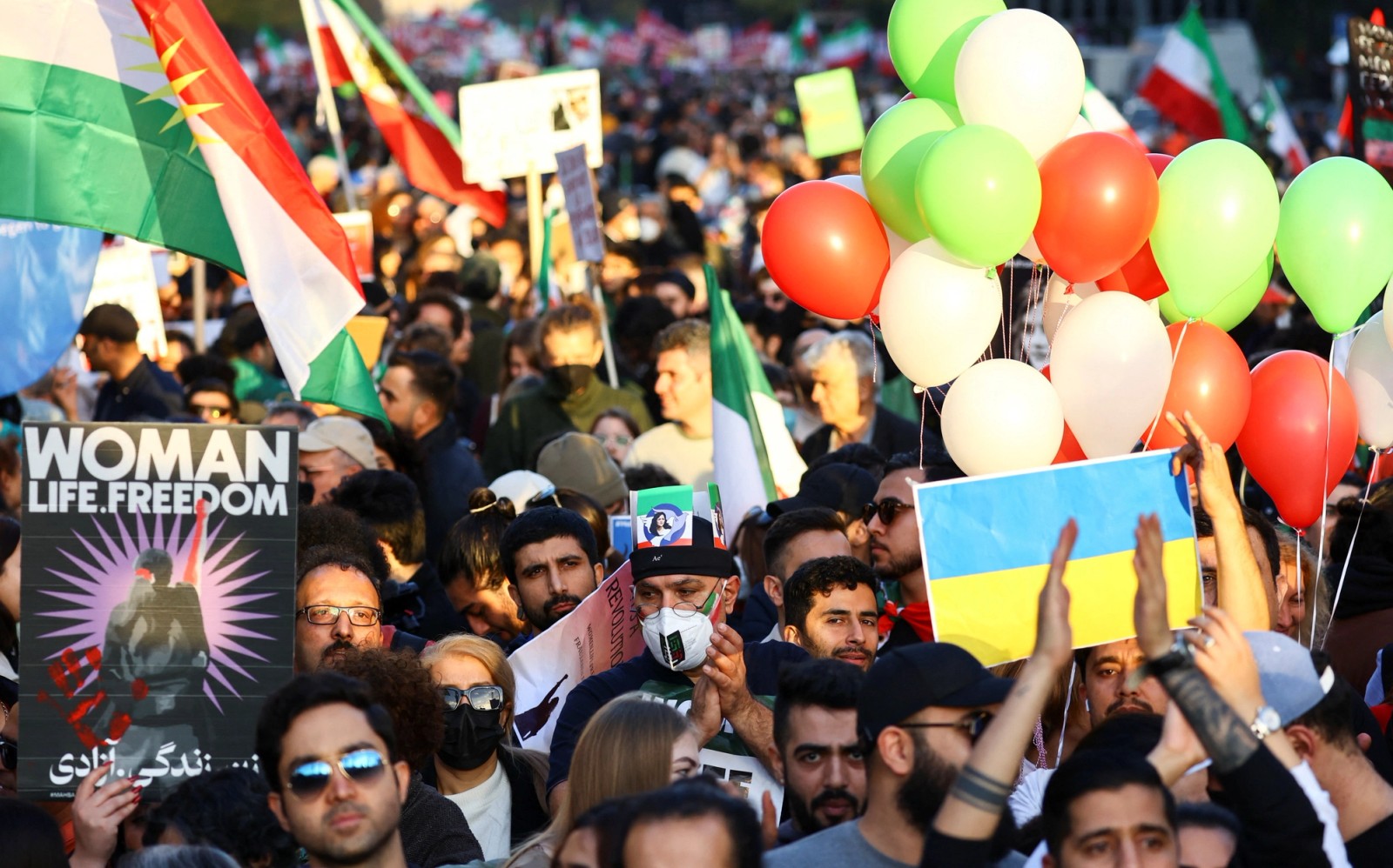 Protesters carried the pictures of Mahsa Amini, the 22-year-old woman who was killed in the custody of Iran’s ‘morality police’, as well as those who lost their lives in the nationwide protest movement since mid-September. They also unfurled a large Iranian pre-revolution national flag, which has become a symbol of rejecting the Islamic Republic.