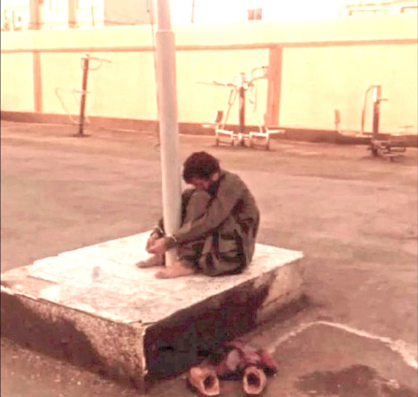 The iconic photo, which is from an earlier event, shows Khodayar Lojei handcuffed to a post while a glass of water is placed near him but with a distance he cannot reach. Several football and futsal players sat in the same position instead of cheering after scoring a goal while another player put a symbolic glass of water near them.