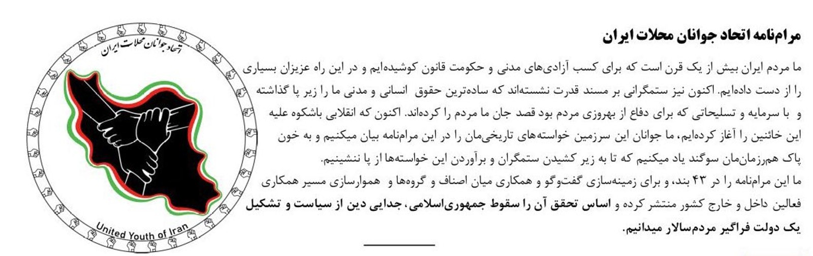 The youth groups alliance says getting rid of the Islamic Republic, separation of religion and state, and the “formation of an inclusive, democratic government” form the cornerstone of the 43-article manifesto, The document highlights the strictly secular nature of any future government.