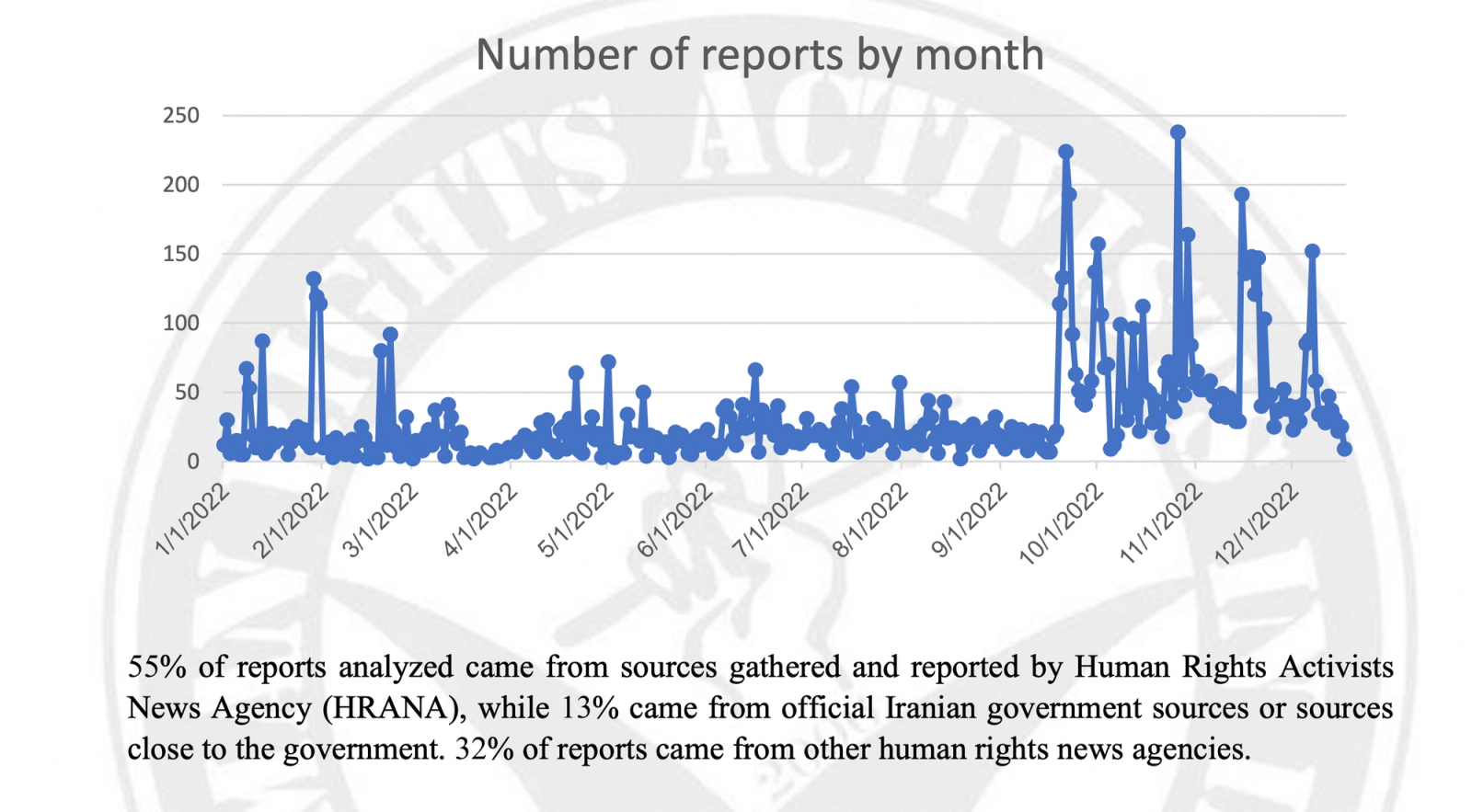The US-based Human Rights Activists News Agency (HRANA) has released a 65-page report on Iran's rights violations based on collection, analysis, and documentation of over 13,000 reports from 267 news sources from January 1 to December 20, 2022.
