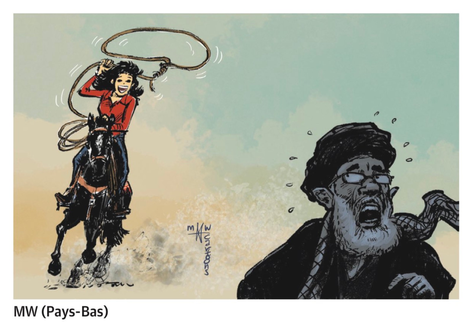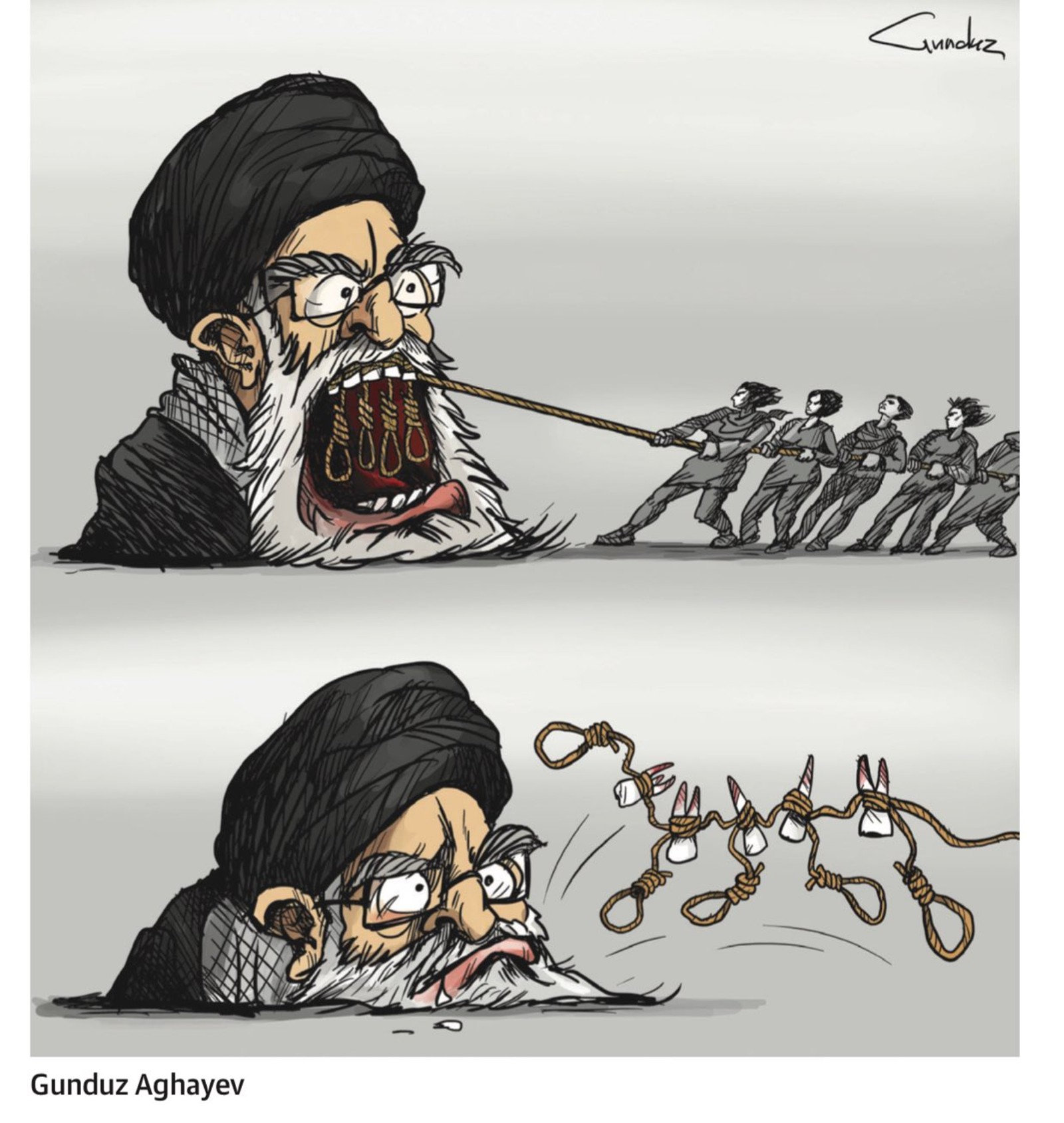 “One cartoon shows Khamenei being punched with the slogan 'Women, Life, Freedom,' while another depicts a mullah being crushed under a heel. Among the very political drawings, the supreme leader is also depicted as Marilyn Monroe, whose dress is lifted by the wind of the headscarves that women have freed themselves from. In another, armed with stones, they pommel him,” Le Monde described some of the works.