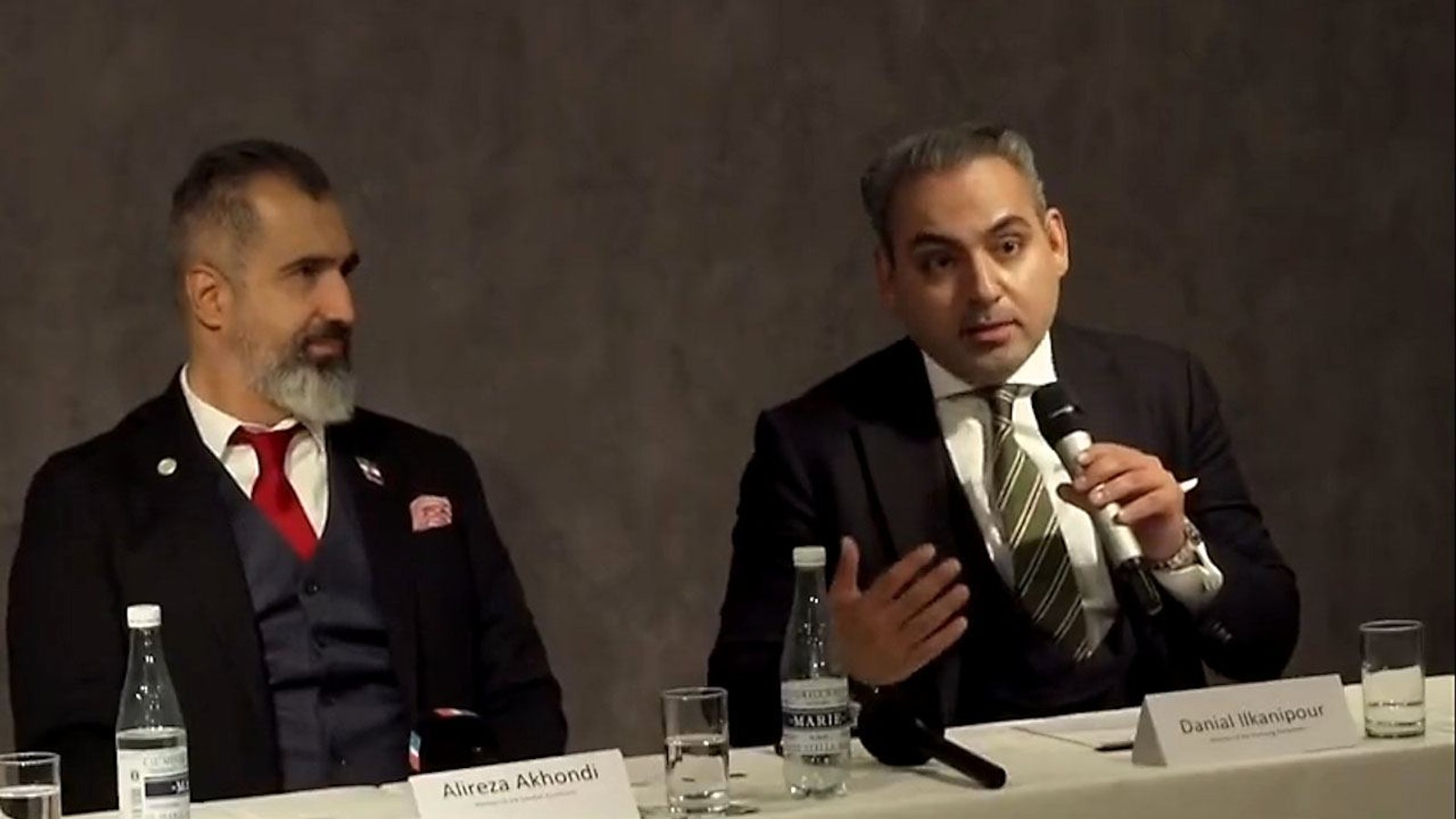Member of the Swedish parliament Alireza Akhondi (left) and member of the Hamburg city parliament Danial Ilkhanipour at an event on February 19, the eve a rally outside the European Parliament in the Belgian capital Brussels