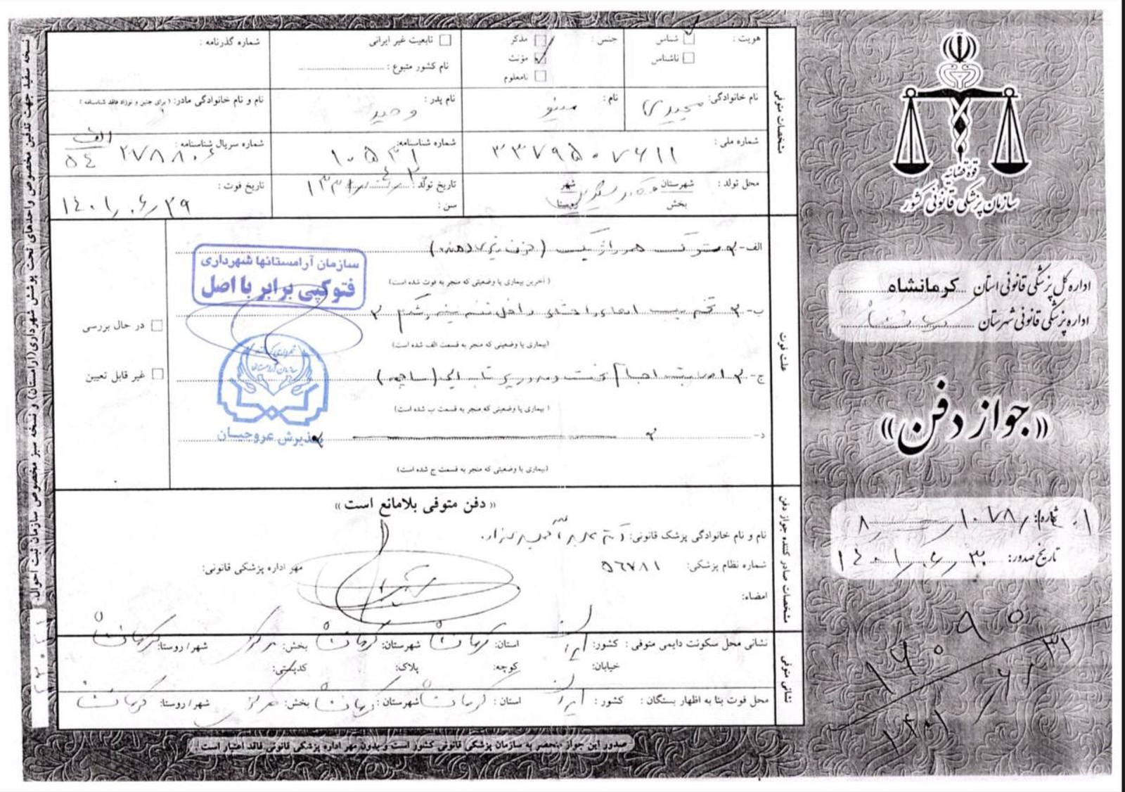 In one of the certificates published by 1500tasvir, the cause of the death of Behnam Layeghpour was declared as “violence by other protesters” despite his family's account of the incident. Layeghpour was reportedly shot two times in his throat and chest from close range in October as his fiancée was watching. A security agent stood over him and prevented people from helping him at gunpoint.