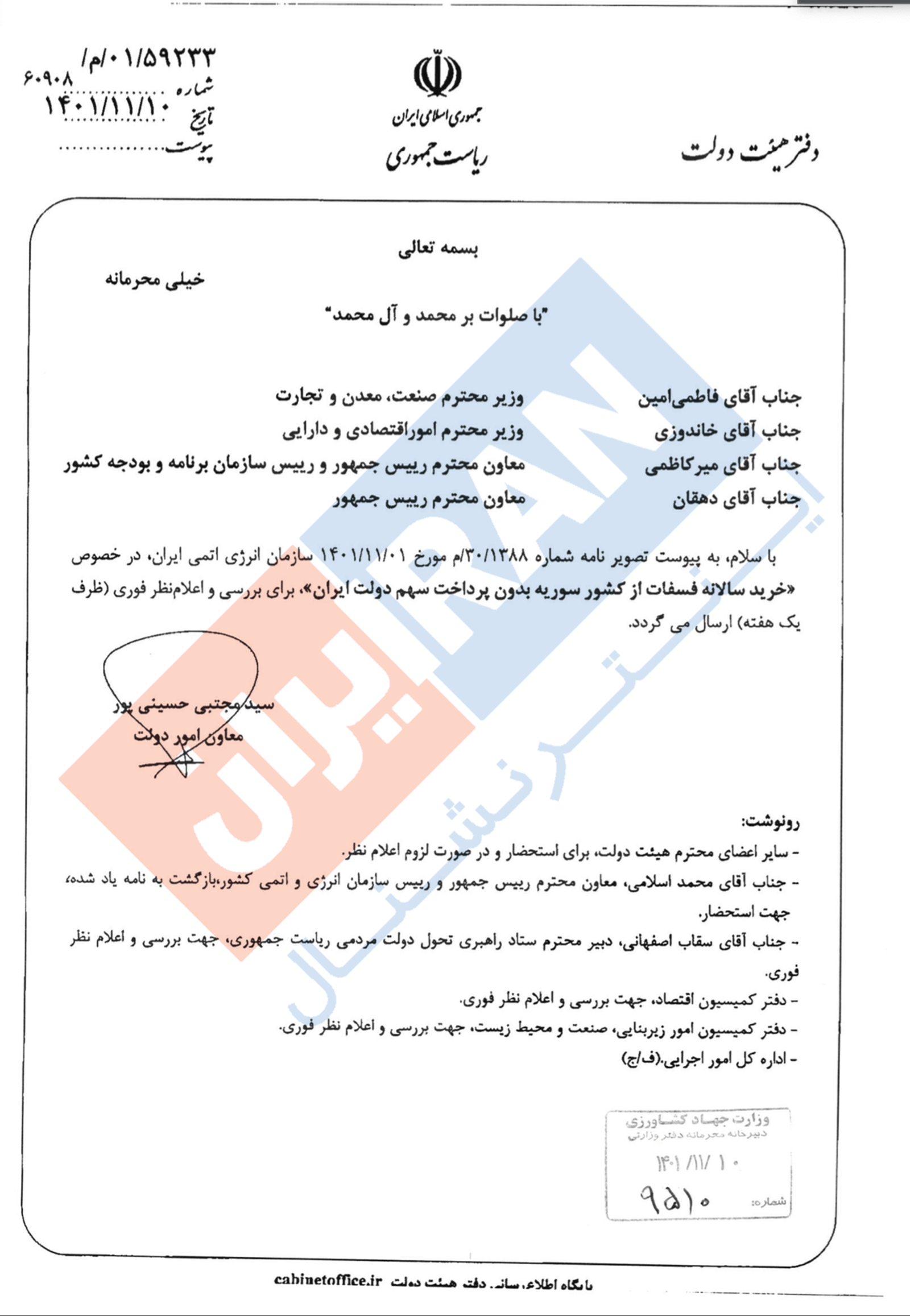 In the letter, the office of the president has asked the officials to decide whether or not they can give the green light to the nuclear agency for “the annual purchase of phosphates from Syria without paying the government’s share.”