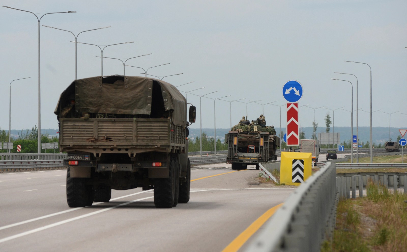 A military column of Wagner private mercenary group drives along M-4 highway, which links the capital Moscow with Russia's southern cities, near Voronezh, June 24, 2023