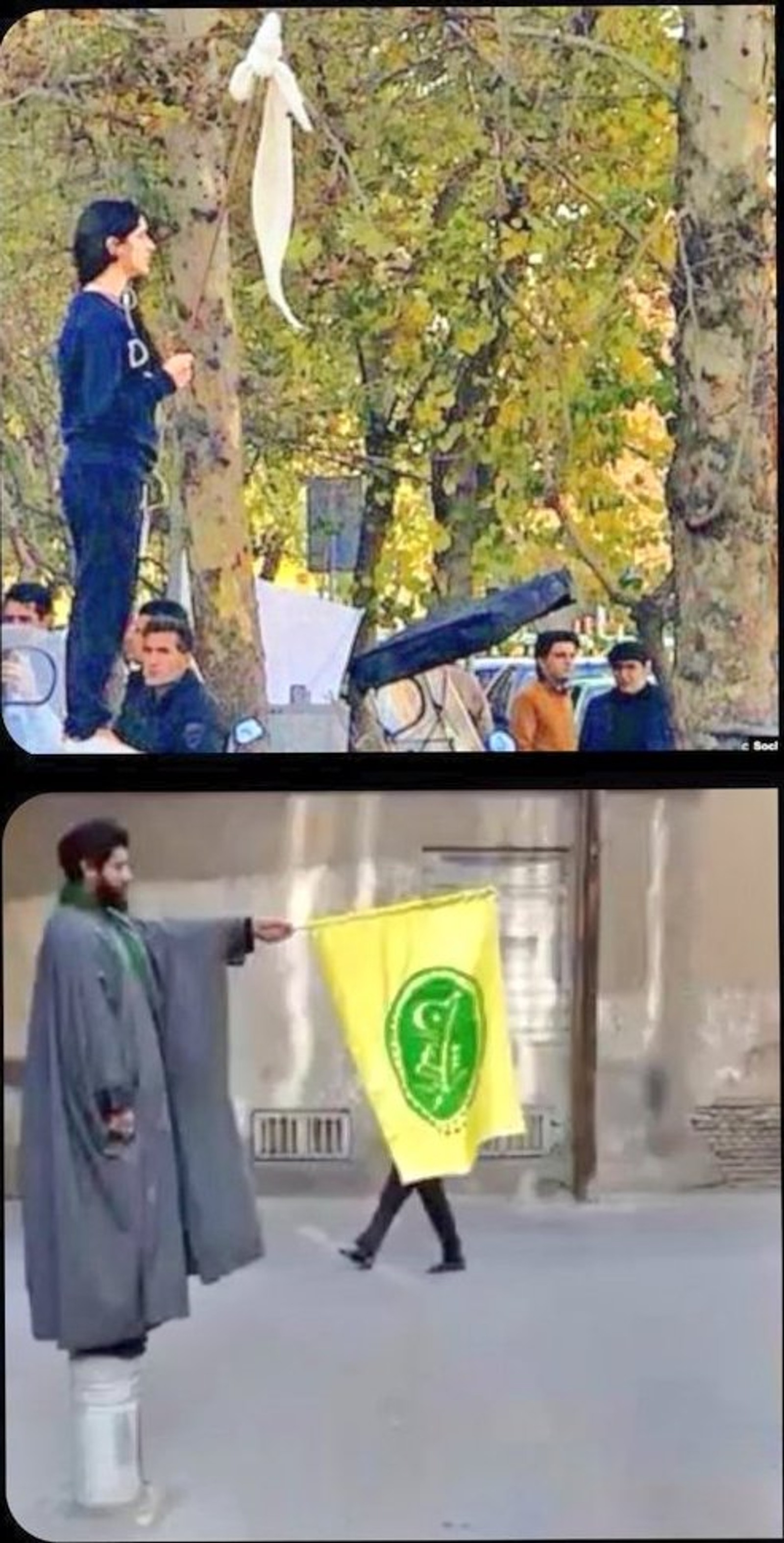 Haghshenas staged a protest against Movahed’s “immorality” holding a banner that said, “I Am a Revolutionary” while standing on a pedestal on the street to mimic Movahed’s action.
