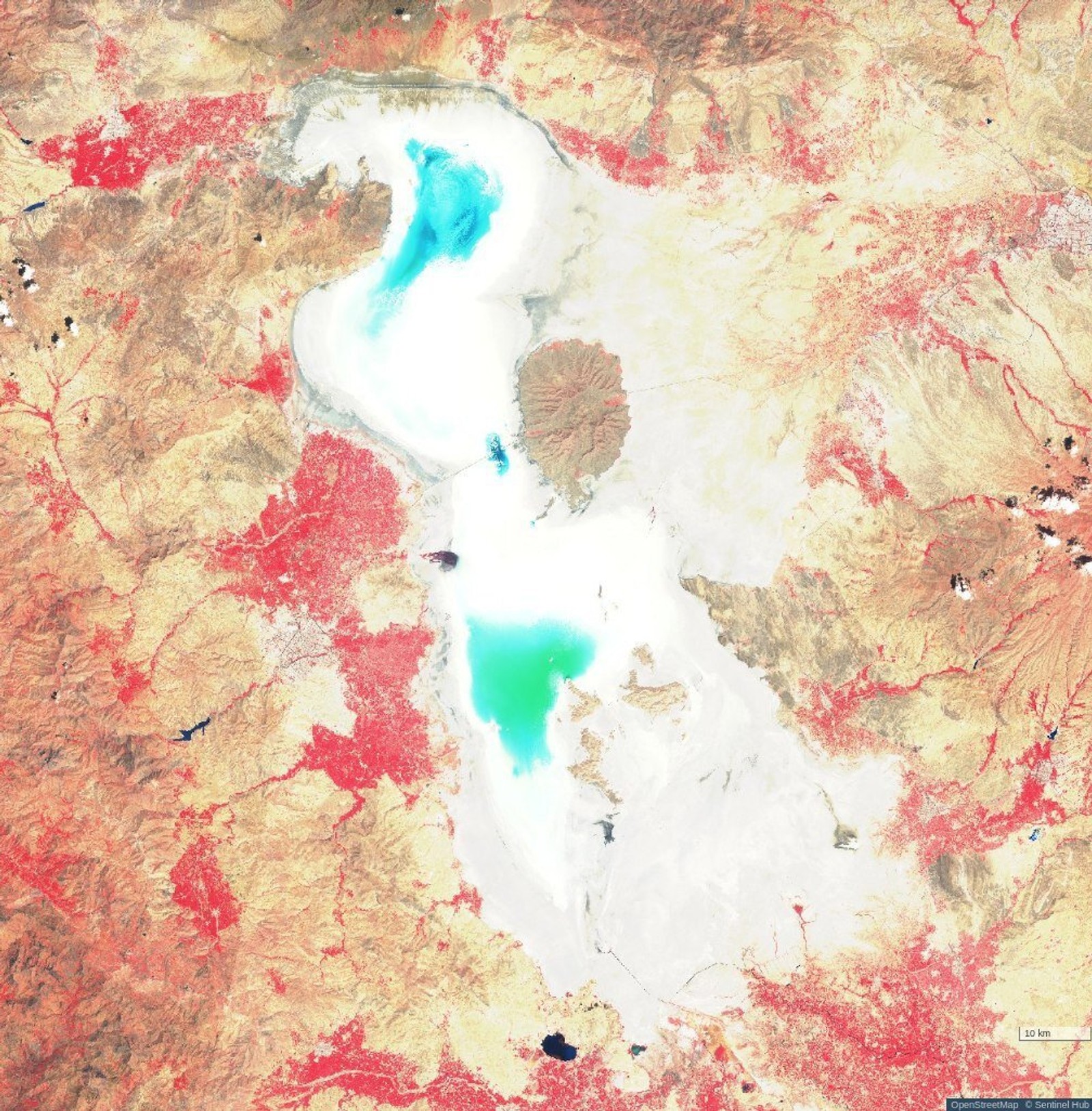 Lake Urmia in northwest Iran, once one of the biggest saltwater lakes in the world, is pictured from the International Space Station as it orbited 258 miles above.