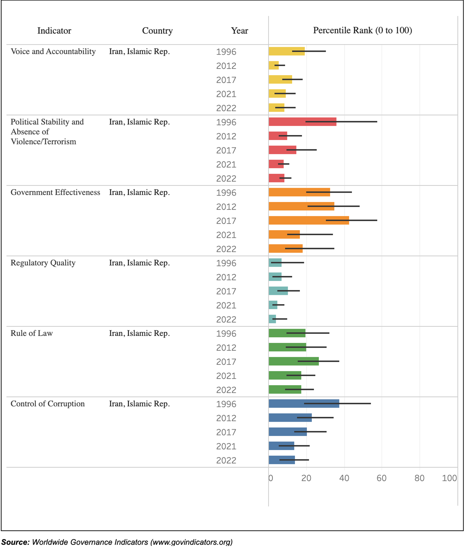 The Political Stability and Absence of Violence/Terrorism index assesses the likelihood of political instability and/or politically motivated violence, including terrorism. In this category, Iran scored -1.59 in 2022. In addition to its being home to the Islamic Revolutionary Guards Corp, Iran has militia proxies across the region from Syria and Lebanon to Yemen and Iraq.