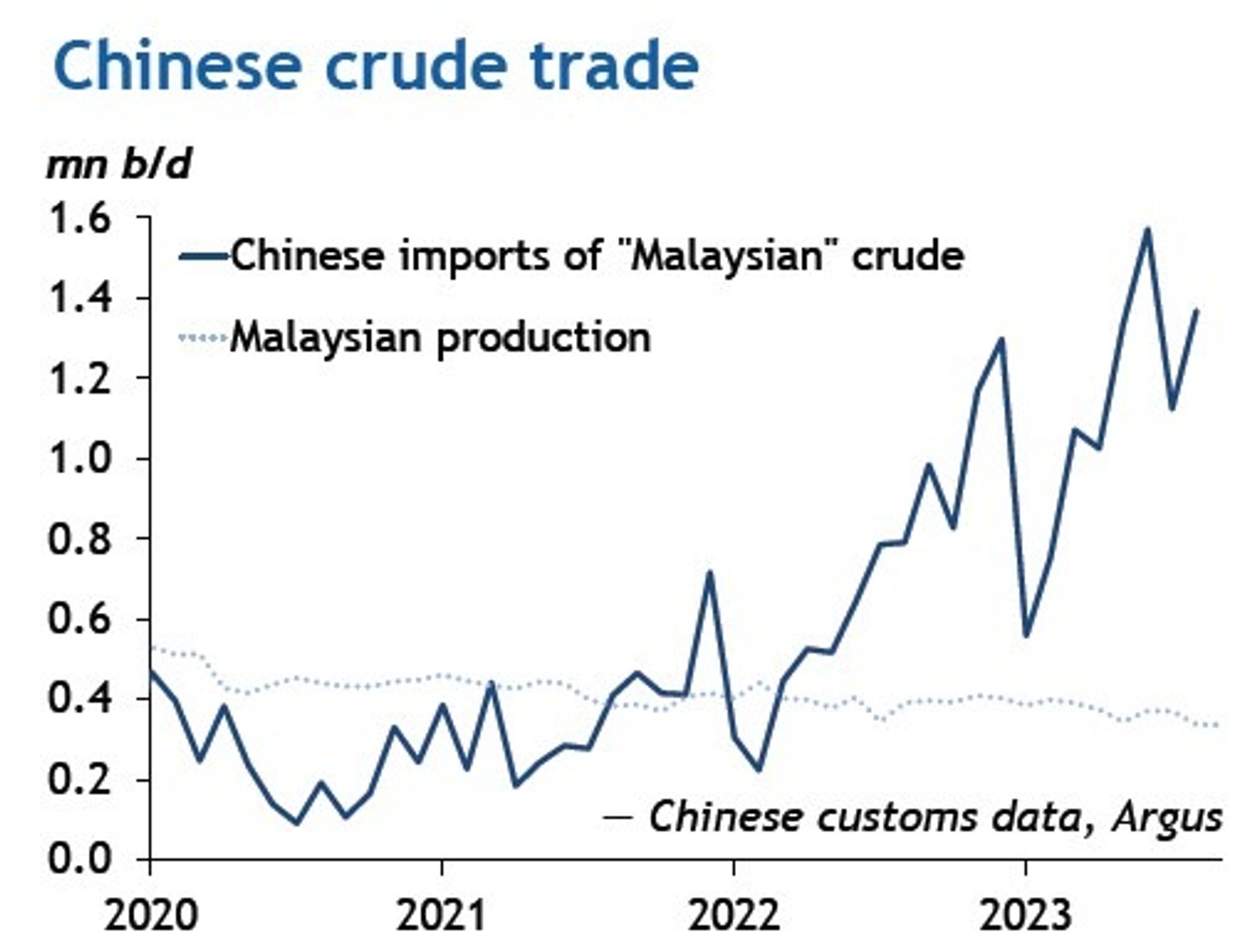 On the other hand, international tanker tracking companies say a huge amount of Iranian oil is sold to China by middlemen and brokers, by ship-to-ship transfers in and the cargoes mostly are rebranded as Malaysian oil. The transfers take place in international waters, and apparently Malaysia does not interfere.