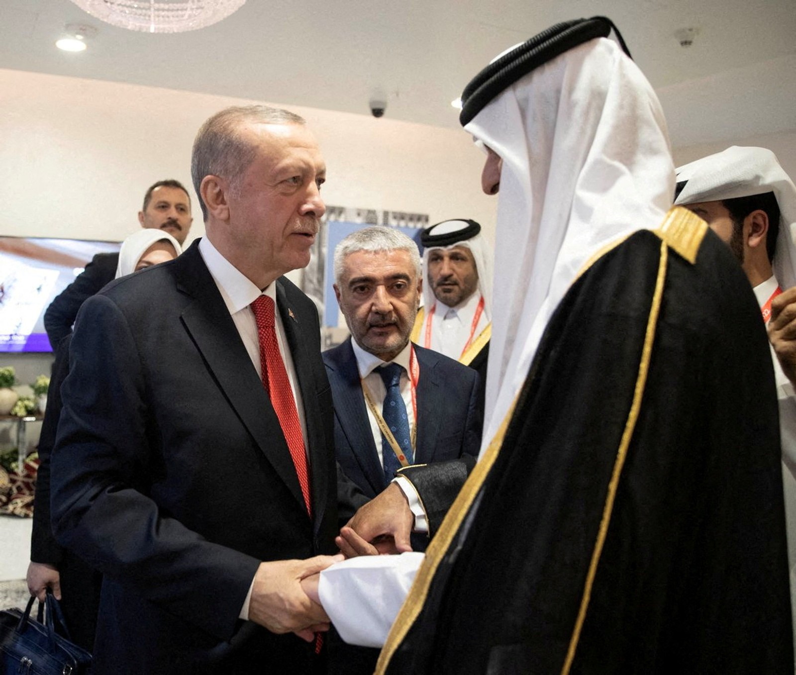 Turkey's President Tayyip Erdogan shakes hands with Qatari Emir Sheikh Tamim bin Hamad Al Thani on the sidelines of the World Cup in Doha, Qatar, November 20, 2022.
